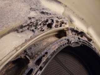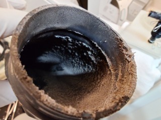 排気ホースを外したところです(画像は清掃前、清掃後)