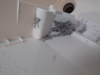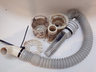 排水ダクト、排水(糸くず)フィルター、排水トラップ、排水口、夫々清掃しました(画像は清掃前、清掃後)