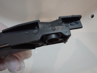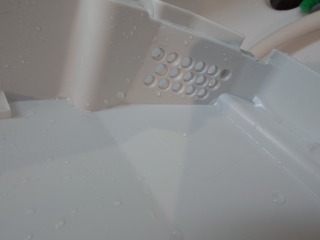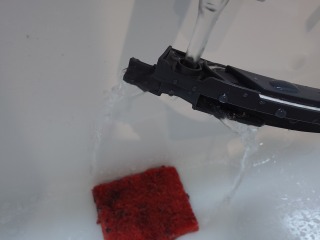 ノズル部に水を流し、窓パッキン清掃用のノズル出口から左右に水が分かれて流れているのを確認しているところです。
