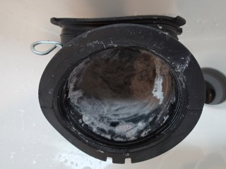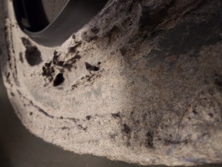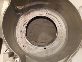 排気ホースを外したところです。綿ぼこりが付着しています(画像は清掃前、清掃後)
