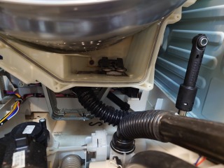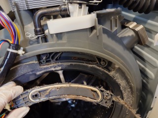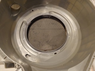 洗濯槽を覆っている前面カバー部には、綿ぼこりが付着しています。