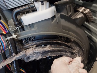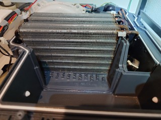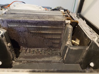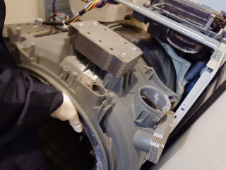 この機種のヒートポンプ内部清掃は、標準作業です。エバポレーター(熱交換器)を中心に汚れています。乾燥に直接影響する部位です。