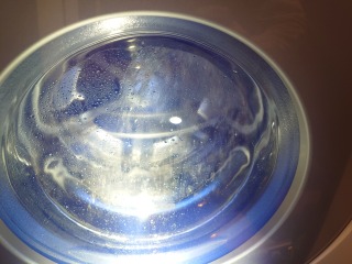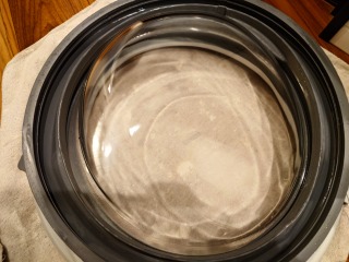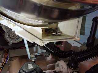 中に入っている水の遠心力の力で洗濯槽をスムーズに回すための流体バランサーです。ケース部を清掃しました(画像は清掃前、清掃後)
