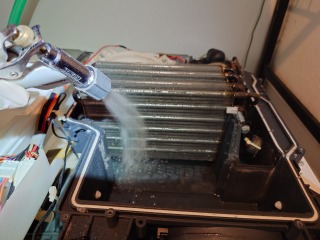 ヒートポンプ洗浄は、エバポレーター(熱交換器)を治具で上方に浮かして清掃しました。これにより、ドレン、ドレンホースに相当する部位も清掃できます。