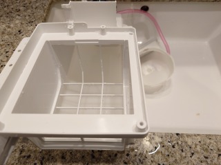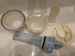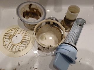 排水ダクト、排水(糸くず)フィルター、排水トラップ、夫々清掃しました(画像は清掃前、清掃後)