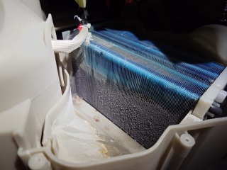 ヒートポンプユニット内部画像です。エバポレーター(熱交換器)下半分に汚れが確認できます。