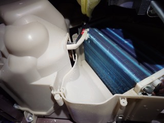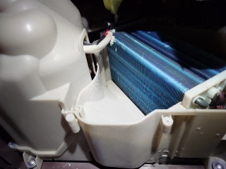 この機種のヒートポンプ内部清掃は、オプション作業です。画像はフレキシブルカメラによる画像ですが、この機種にはエバポレーター(熱交換器)自動洗浄の機能が搭載されているので、上の部分(画像の下の部分)は比較的キレイですが、下の方には目詰まり箇所があります。お客様と相談の上、内部清掃を行う事になりました。