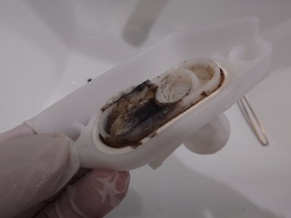 シャワージョイント部も洗浄しました(画像は清掃前、清掃後)