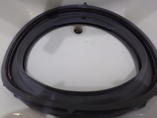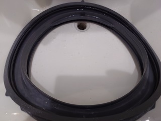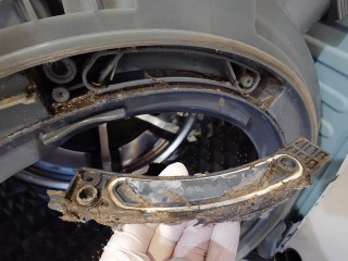 中に入っている水の遠心力の力で洗濯槽をスムーズに回す流体バランサーです(画像は清掃前、清掃後)