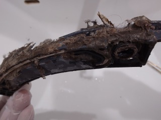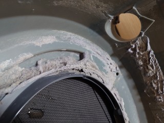 排気ホースを外したところです。綿ぼこりが付着しています(画像は清掃前、清掃後)