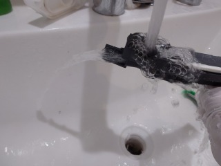シャワー用ノズルから分岐して、窓パッキン洗浄用水流ノズル、これが詰まってしまっています。詰まり部分を洗浄しました。