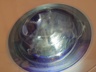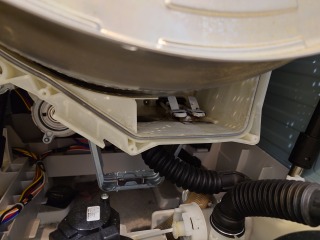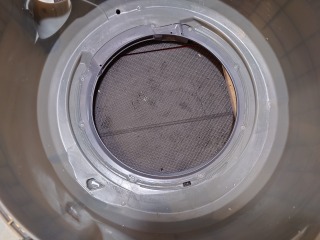 洗濯槽を覆っている前面カバー部には、綿ぼこりが付着しています。しかし形状がシンプルになった分、清掃はし易くなりました。