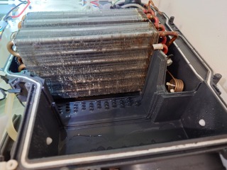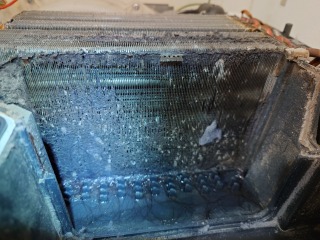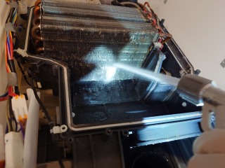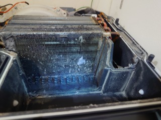 この機種のヒートポンプユニット内部清掃は、標準作業です。エバポレーター(熱交換器)に目詰まりが発生しています。