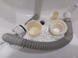 排水ダクト、排水(糸くず)フィルター、排水トラップ、排水口、夫々清掃しました(画像は清掃前、清掃後)