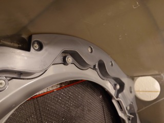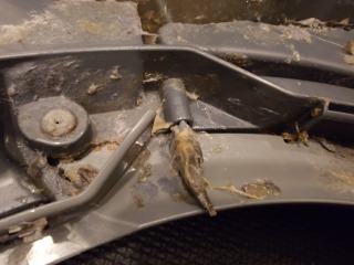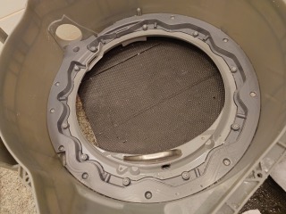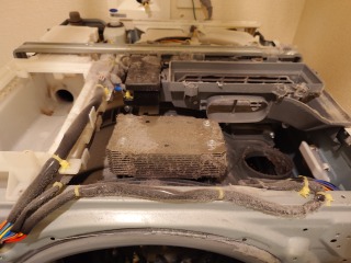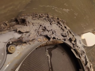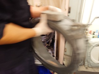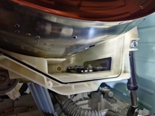 洗濯槽を覆っている前面カバー部には、大量の綿ぼこりが付着していました。この部位の綿ぼこりは、3つの悪さを働きます。1つ目は臭いを発します。2つ目は、洗剤(柔軟剤)を含んでしまい、無駄が発生します。洗濯機が計算する洗剤量は、この分を含んでいません。3つ目は、十分に水を含んだ綿ぼこりは、回転しない部位のために脱水運転で水を切ることがない状態で、乾燥運転に入ることから、乾燥時間に影響を与えます。