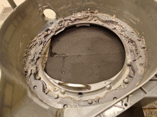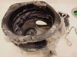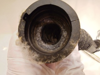 排気ホースを外したところです。綿ぼこりが付着しています(画像は清掃前、清掃後)