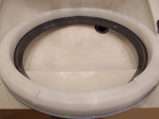 中に水が入っており、その遠心力で洗濯槽をスムーズに回すための流体バランサーです。ケース部を清掃しました(画像は清掃前、清掃後)