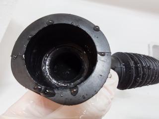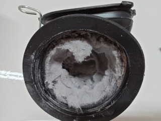 排気ホースを外したところです。綿ほこりが付着しています(画像は清掃前、清掃後)
