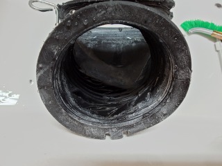 洗濯、すすぎ中に作動する循環水路ダクトです。ここを通った水が戻ってきますので、キレイにしておきたいポイントの1つです(画像は清掃前、清掃後)