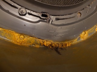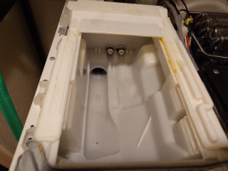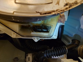 分解前、動作確認時に、全方位シャワー用循環水が、洗濯槽最下部より、漏れ出しているのが確認できました。