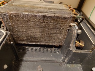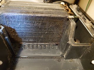 この機種のヒートポンプ内部清掃は、標準作業です。汚れが付着しています。