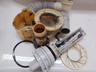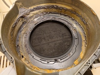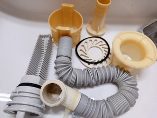 排水ダクト、排水(糸くず)フィルター、排水トラップ、夫々清掃しました(画像は清掃前、清掃後)