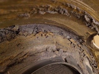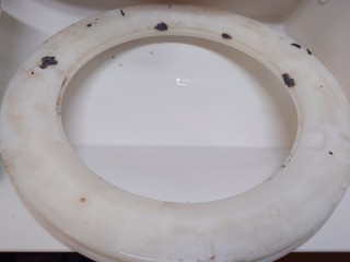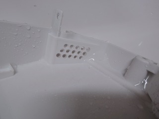 カバー最下部には、全方位シャワー用の水路が浮いてしまい、循環水が漏れてしまっている痕跡があります。お客様と相談の上、新品パーツに交換しました。