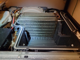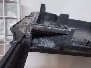 ヒートポンプユニットの蓋裏です。エバポレーター(熱交換器)自動洗浄のノズルがあります。また、風の通り道は、目詰まり状態でした。