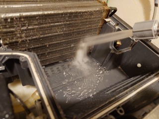ヒートポンプ洗浄は、エバポレーター(熱交換器)を治具により上方に浮かして清掃しました。これにより、ドレンに相当する部位の清掃も行えます。