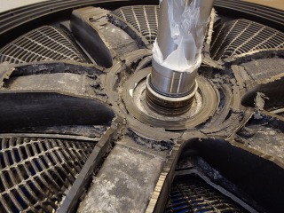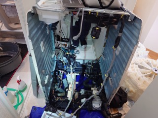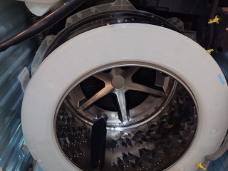 この洗濯乾燥機は、2017年発売開始で当時のフラッグシップモデルです。点検の結果、ベアリングの劣化により洗濯槽の回転時に擦りがあり、洗濯水槽、洗濯槽のセット交換が必要だと診断しました。