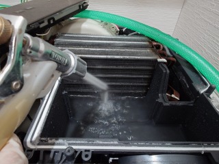 今回は、ヒートポンプ内部清掃も込みのセット作業です。もちろんエバポレーター(熱交換器)を上方に浮かしての清掃です。