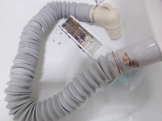 画像は、排水トラップを外したところです(画像は清掃前、清掃後)